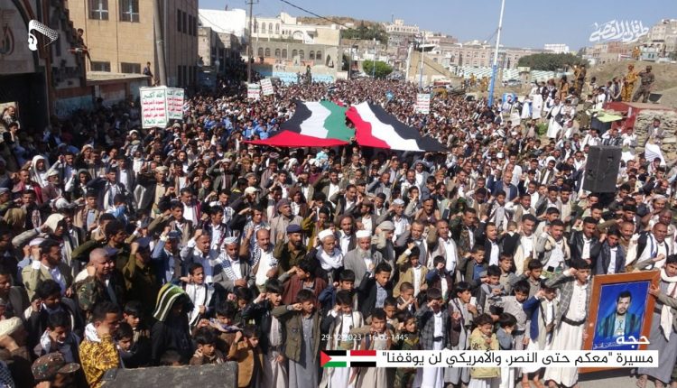 شهدت محافظة حجة، اليوم، مسيرات ووقفات جماهيرية نصرة للشعب الفلسطيني المظلوم تحت شعار “معكم حتى النصر، والأمريكي لن يوقفنا”.