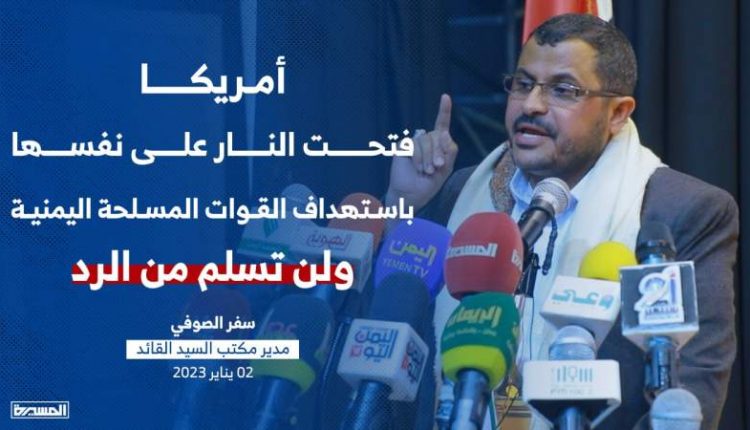 أكد مدير مكتب السيد القائد سفر الصوفي، اليوم الثلاثاء، أن أمريكا فتحت النار على نفسها باستهداف القوات المسلحة اليمني، مشددا على أن الولايات المتحدة لن تسلم من الرد.