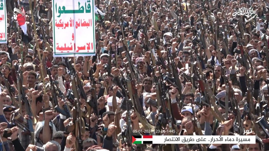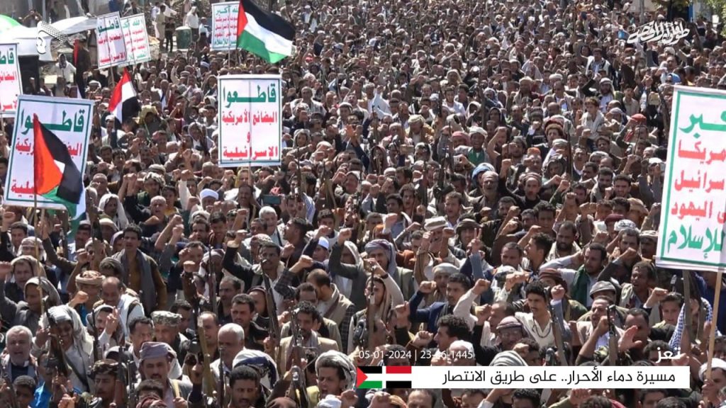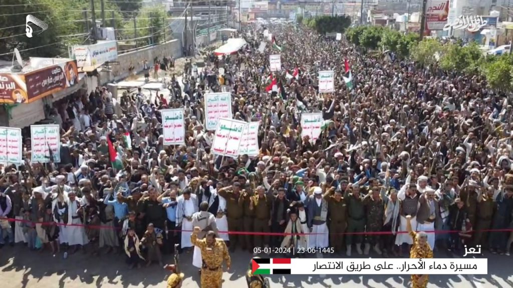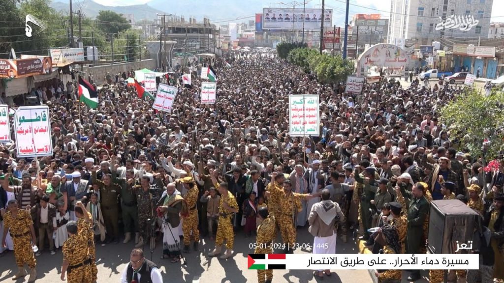 ورفع المشاركون في المسيرة التي تقدّمها نائب رئيس مجلس الشورى عبده محمد الجندي، والقائم بأعمال محافظ تعز أحمد أمين المساوى، ورئيس محكمة الاستئناف بالمحافظة القاضي عبدالعزيز الصوفي، وعدد من أعضاء مجلس الشورى، ووكلاء المحافظة ومدراء المكاتب التنفيذية والمديريات، وقيادات عسكرية وأمنية، وشخصيات اجتماعية وعلماء، الشعارات المنددة بجرائم العدوان الأمريكي الصهيوني على غزة.