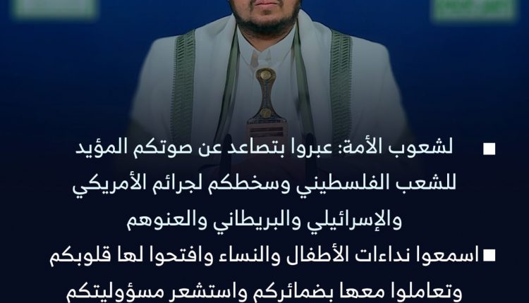 أكد قائد الثورة السيد عبد الملك بدر الدين الحوثي على مسؤولية الأمة تجاه ما يجري في غزة من جرائم وحرب إبادة يرتكبها العدو الصهيوني بحق الأبرياء في غزة.