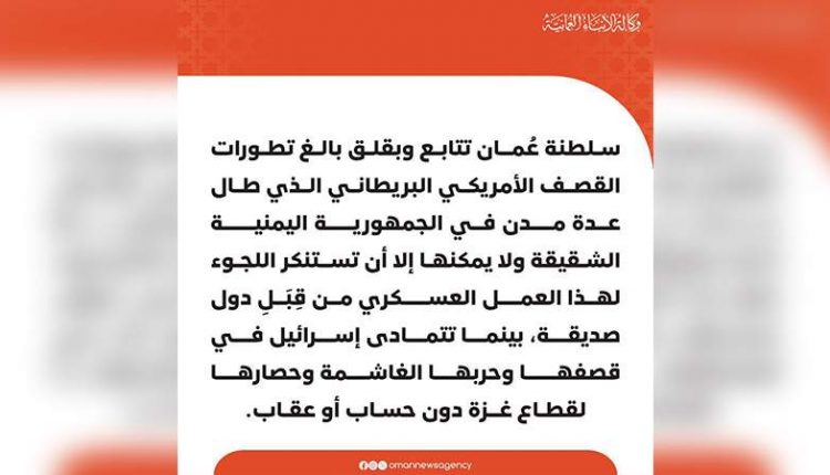 ووفق وكالة الأنباء العمانية قالت وزارة الخارجية في بيان: تتابع سلطنة عُمان وبقلق بالغ تطورات القصف الأمريكي البريطاني الذي طال عِدة مدن في الجمهورية اليمنية الشقيقة ولا يمكنها إلا أن تستنكر اللجوء لهذا العمل العسكري من قِبَلِ دول صديقة، بينما تتمادى “إسرائيل” في قصفها وحربها الغاشمة وحصارها لقطاع غزة دون حساب أو عقاب.