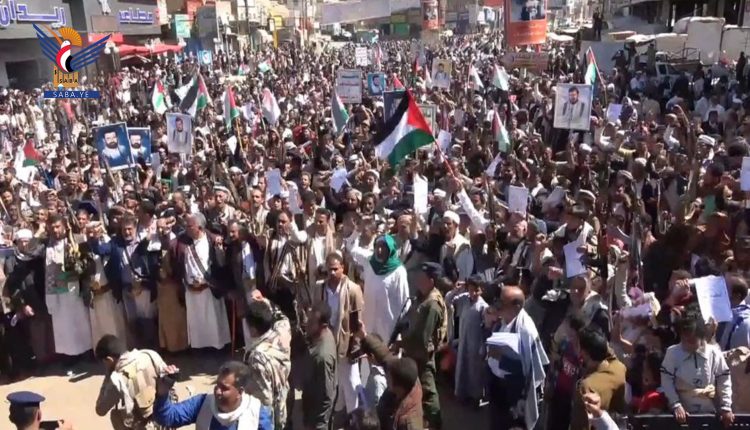 ورفعت الحشود المشاركة في المسيرة العلمين اليمني والفلسطيني وشعارات التحدي للتحالف الأمريكي لحماية السفن الإسرائيلية والتأكيد على الموقف الثابت للشعب اليمني لمناصرة ودعم القضية الفلسطينية على مختلف المستويات العسكرية والاقتصادية والسياسية والإعلامية .