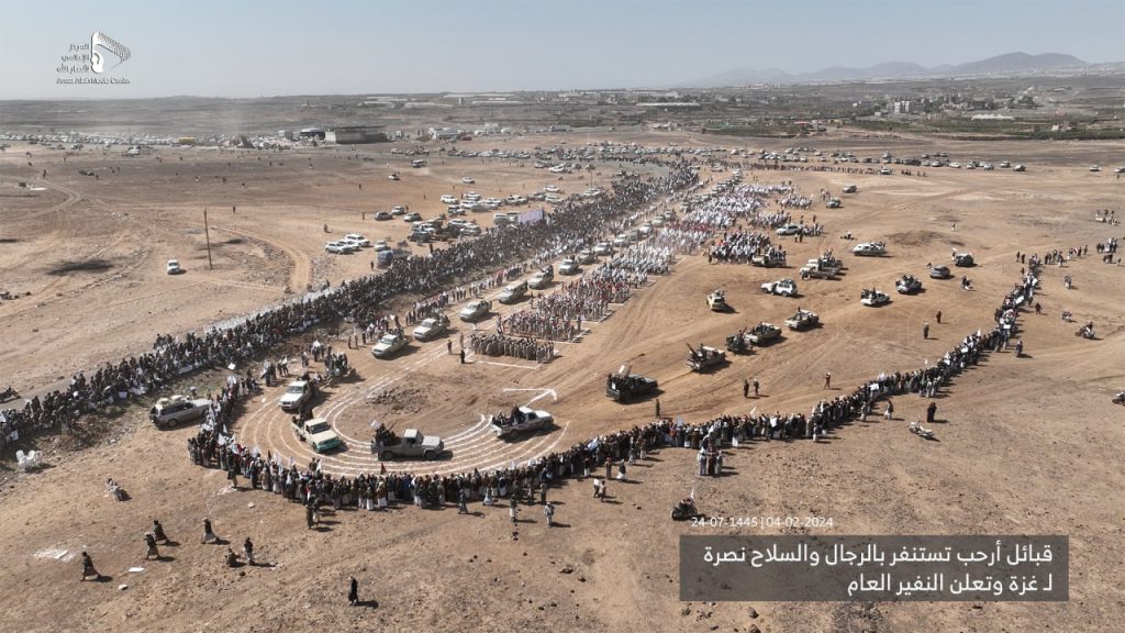 وقال “بعد العدوان الأمريكي البريطاني على عدد من المحافظات اليمنية ليل أمس نصرة لإسرائيل، اليوم تخرج قبيلة أرحب بعد ساعات من الغارات وتقول كلمتها برجالها وسلاحها ومالها في رسالة من اليمن للعالم أن القبيلة اليمنية حاضرة نصرة لأهلنا في غزة وفلسطين”.