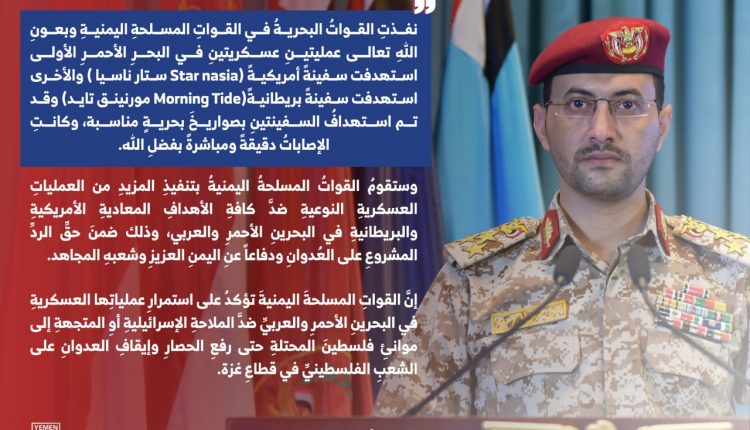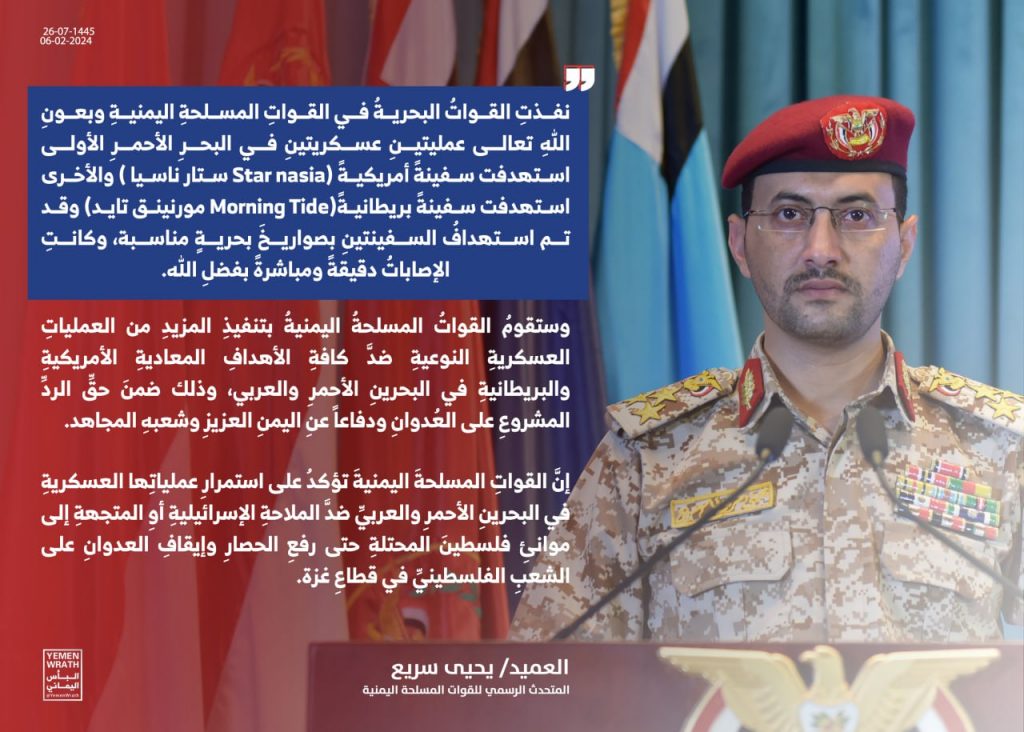 وأوضحت القوات المسلحة في بيان لها، أن القوات البحرية نفذت عمليتينِ عسكريتينِ في البحرِ الأحمرِ، الأولى استهدفت سفينةً أمريكيةً (Star nasia ستار ناسيا ) والأخرى استهدفت سفينةً بريطانيةً(Morning Tide مورنينق تايد)، وذلك بصواريخ بحرية مناسبة.