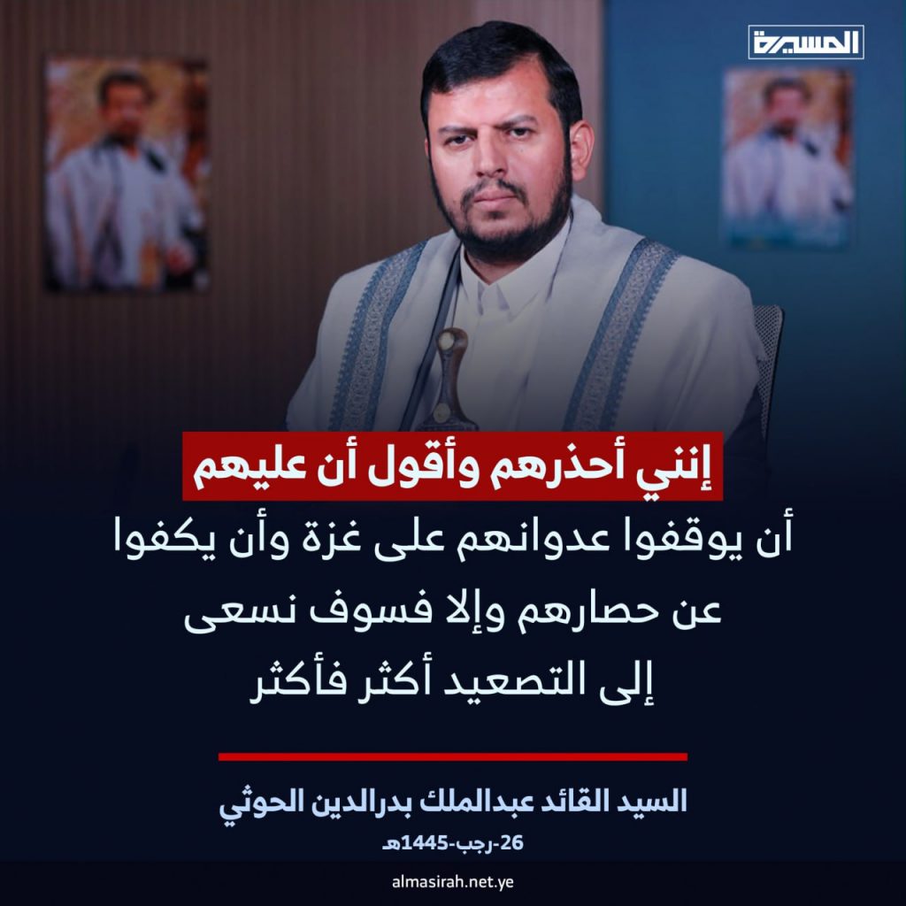 أكد قائد الثورة السيد عبدالملك بدر الدين الحوثي في كلمة له، اليوم الثلاثاء، بمناسبة ذكرى الشهيد القائد أن البحر الأحمر ومضيق باب المندب أصبح ولأول مرة بهذا المستوى من الفعالية والضغط على الأعداء .. موضحا أن  تأثير موقف بلدنا وانزعاج اللوبي اليهودي من فاعليته هو ما أو صل بالأمريكي والبريطاني للتورط في حرب ضد بلدنا..