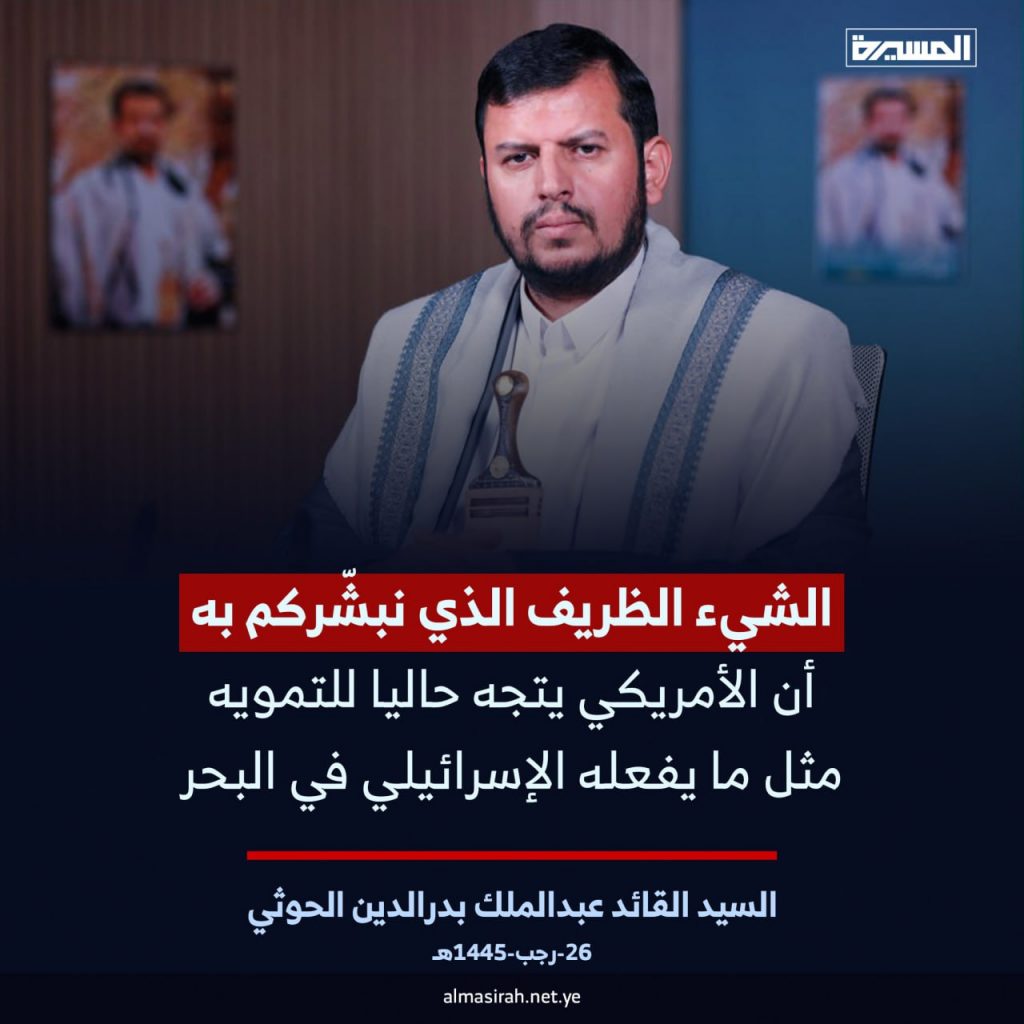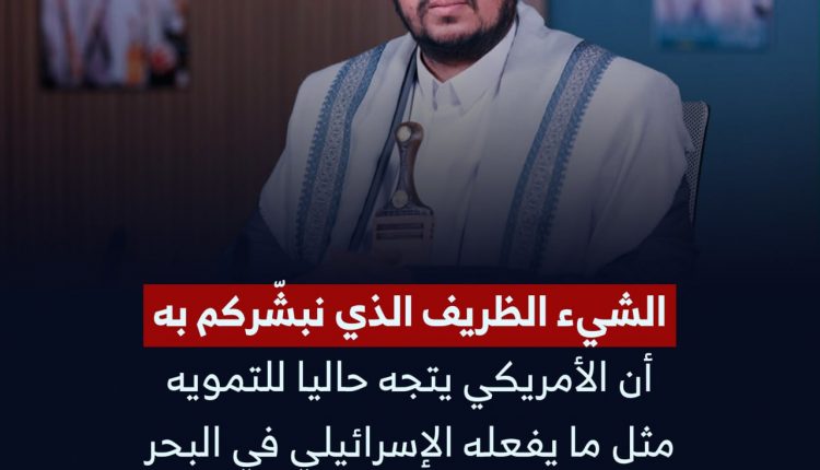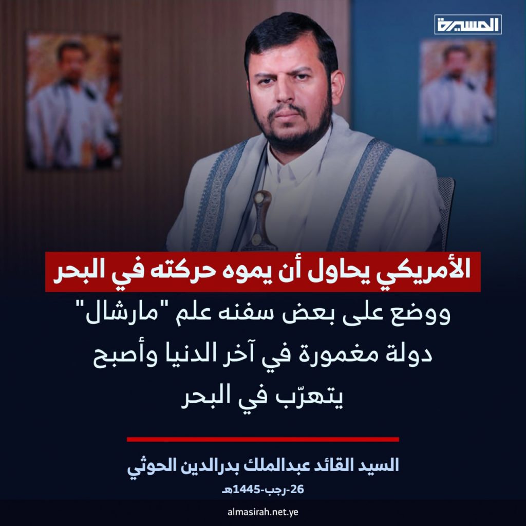 وقال السيد: الشيء الظريف الذي نبشّركم به أن الأمريكي يتجه حاليا للتمويه مثل ما يفعله الإسرائيلي في البحر.. مضيفا أن الأمريكي يحاول أن يموه حركته في البحر ووضع على بعض سفنه علم “مارشال”  وهي دولة مغمورة في آخر الدنيا وأصبح يتهرّب في البحر.