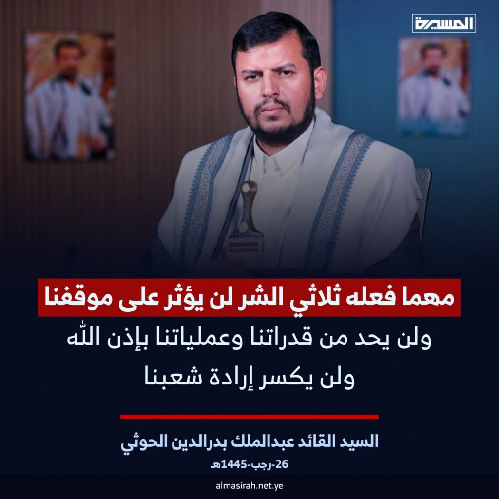 وجدد السيد القائد التأكيد على  موقفنا المبدئي القرآني في مساندة الشعب الفلسطيني والتصدي للعدوان على بلدنا و مهما فعله ثلاثي الشر لن يؤثر على موقفنا ولن يحد من قدراتنا وعملياتنا بإذن الله ولن يكسر إرادة شعبنا.