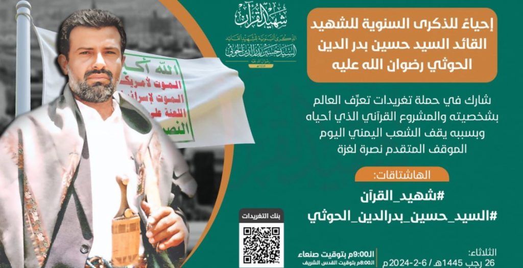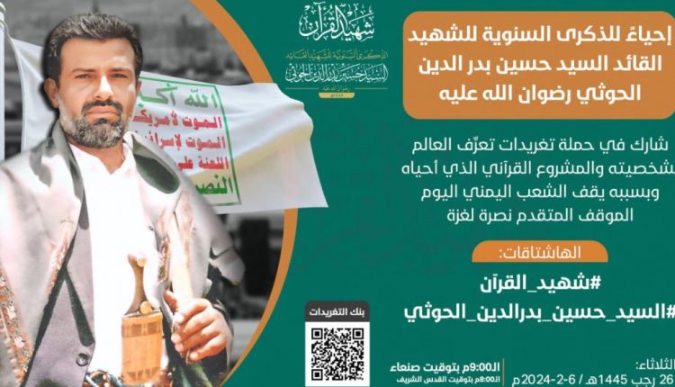 تنطلق في الساعة التاسعة من مساء اليوم، حملة تغريدات على مواقع التواصل الاجتماعي، إحياءً للذكرى السنوية للشهيد القائد السيد حسين بدر الدين الحوثي رضوان الله عليه.