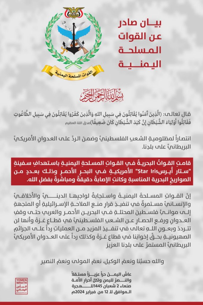 في 12 فبراير 2024 نفذت القواتُ البحريةُ في القواتِ المسلحةِ اليمنيةِ باستهدافِ سفينةِ “ستار أَيرسStar Iris ” الأمريكيةِ في البحرِ الأحمرِ وذلك بعددٍ من الصواريخِ البحرية المناسبةِ وكانتِ الإصابةُ دقيقةً ومباشرةً.