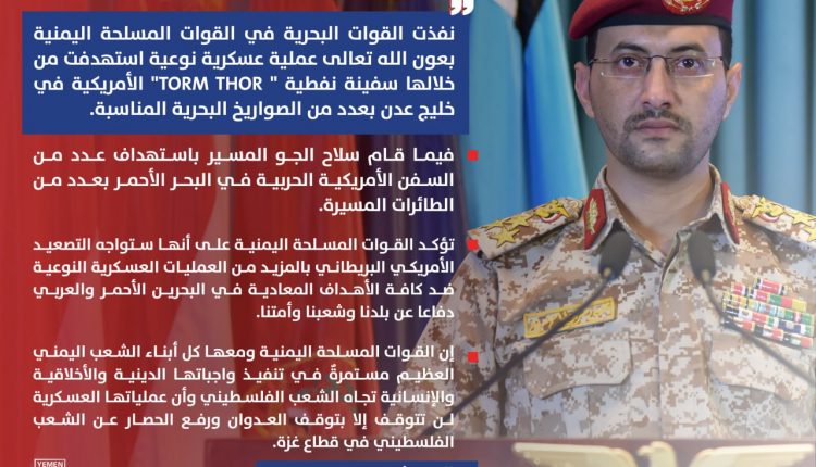 نفذتِ القواتُ البحريةُ في القواتِ المسلحةِ اليمنيةِ بعونِ اللهِ تعالى عمليةً عسكريةً نوعيةً استهدفتْ من خلالِها سفينةَ نفطية ” TORM THOR” الأمريكيةَ في خليجِ عدن بعددٍ من الصواريخِ البحريةِ المناسبة.
