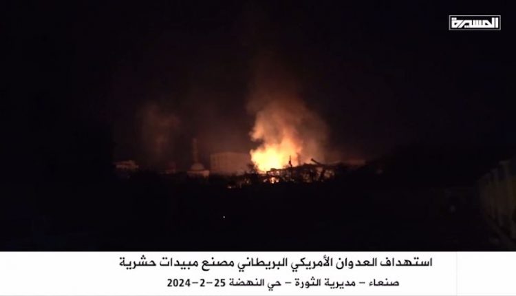 مشاهد من استهداف العدوان الأمريكي البريطاني مصنع مبيدات حشرية بحي النهضة مديرية الثورة بأمانة العاصمة صنعاء .. وتضرر المنازل المجاورة للمصنع.