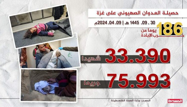 وأوضحت الوزارة أن حصيلة ضحايا العدوان الصهيوني على غزة منذ السابع من أكتوبر ارتفعت إلى 33.360 شهيدا و75.993 إصابة.