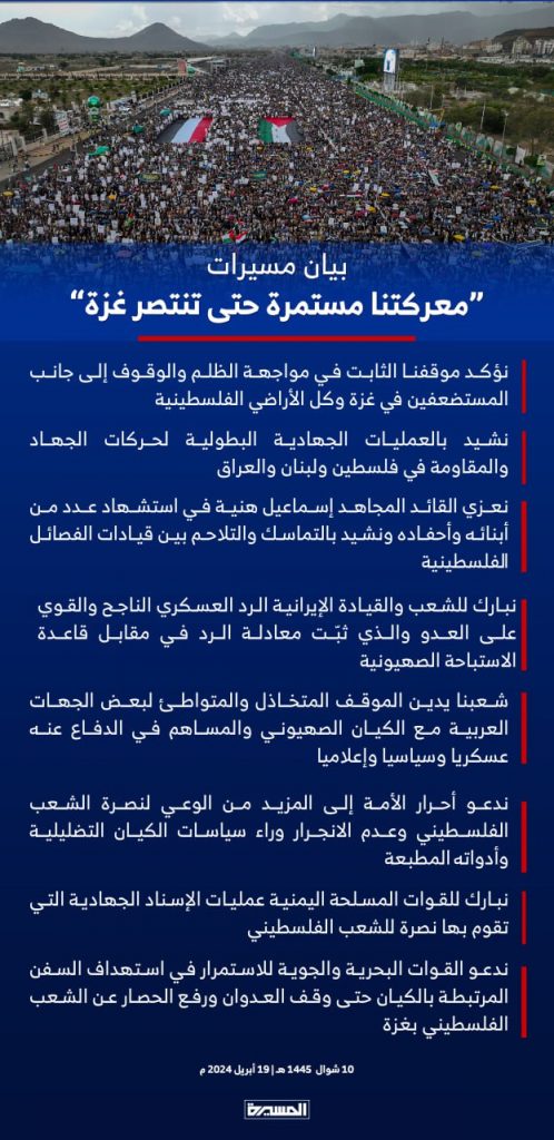 وأكدت الحشود موقف اليمن الثابت والمبدئي في دعم ومساندة الشعب الفلسطيني وقضيته العادلة انطلاقا من الواجب الديني والقومي والإنساني، والاستمرار في إقامة المسيرات والفعاليات والأنشطة المناصرة للشعب الفلسطيني وكذا الاستمرار في تنفيذ العمليات العسكرية في البحر الأحمر والبحر العربي والمحيط الهندي.