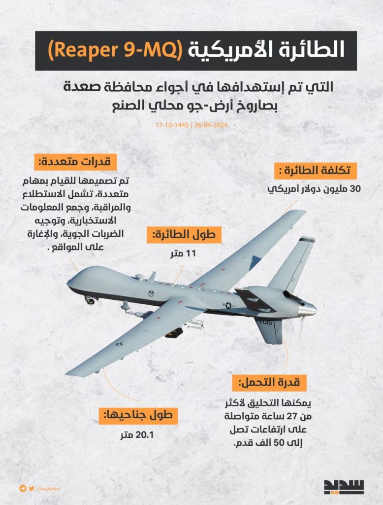 شاهد/ مواصفات الطائرة الأمريكية MQ9 التي أسقطتها الدفاعات الجوية اليمنية في سماء محافظة صعدة (صورة) On أبريل 27, 2024 الصمود| مواصفات الطائرة الأمريكية MQ9 مشاركة