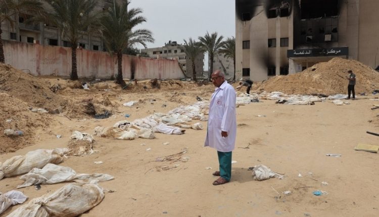 وأوضح المكتب في تقريره أنه “جرى اكتشاف ثلاث مقابر جماعية في مجمع ناصر الطبي، واحدة أمام المشرحة، والثانية خلفها، والثالثة بالقرب من مبنى غسيل الكلى”.