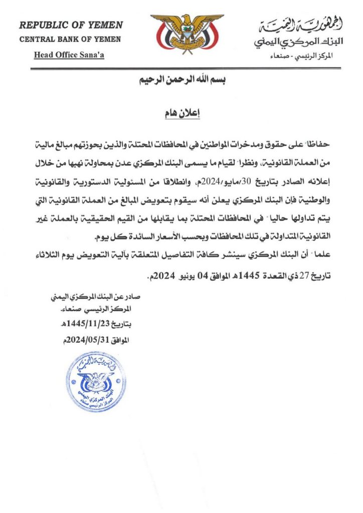 حفاظاً على حقوق ومدخرات المواطنين في المحافظات المحتلة والذين بحوزتهم مبالغ مالية من العملة القانونية ونظراً لقيام ما يسمى بالبنك المركزي – عدن بمحاولة نهبها من خلال إعلانه الصادر بتاريخ 30 مايو 2024م، وانطلاقاً من المسؤولية الدستورية والقانونية والوطنية، فإن البنك المركزي يعلن أنه سيقوم بتعويض المبالغ من العملة القانونية التي يتم تداولها حالياً في المحافظات المحتلة بما يقابلها من القيم الحقيقية بالعملة غير القانونية المتداولة في تلك المحافظات وبحسب الأسعار السائدة كل يوم.
