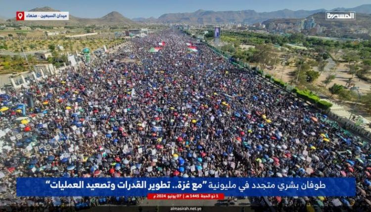 حشد مليوني في ميدان السبعين بالعاصمة صنعاء إسناداً للشعب الفلسطيني تحت شعار (مع غزة.. تطوير القدرات وتصعيد العمليات)