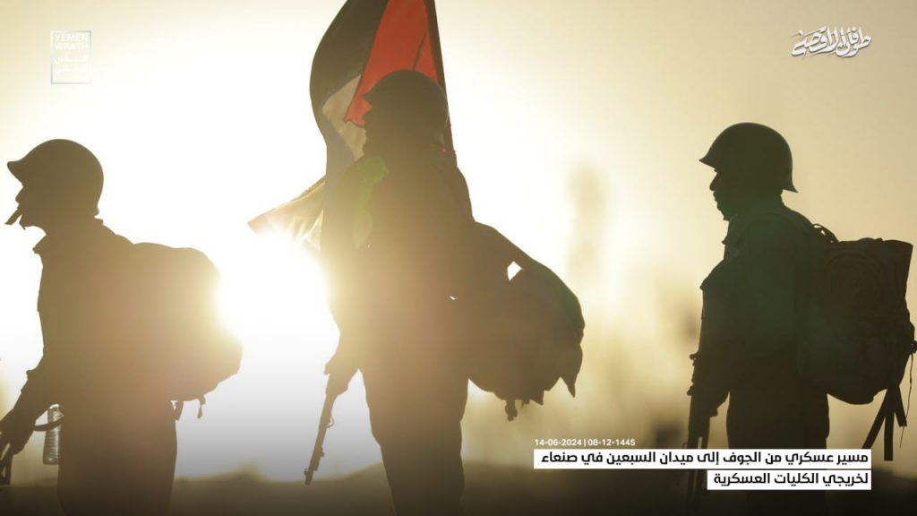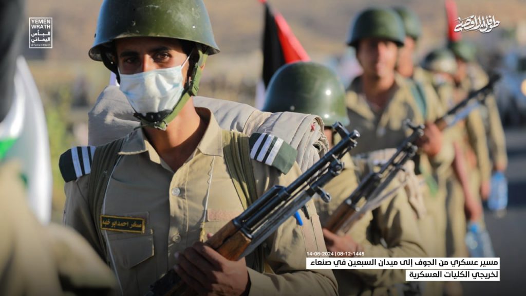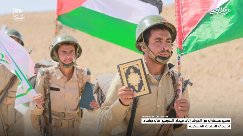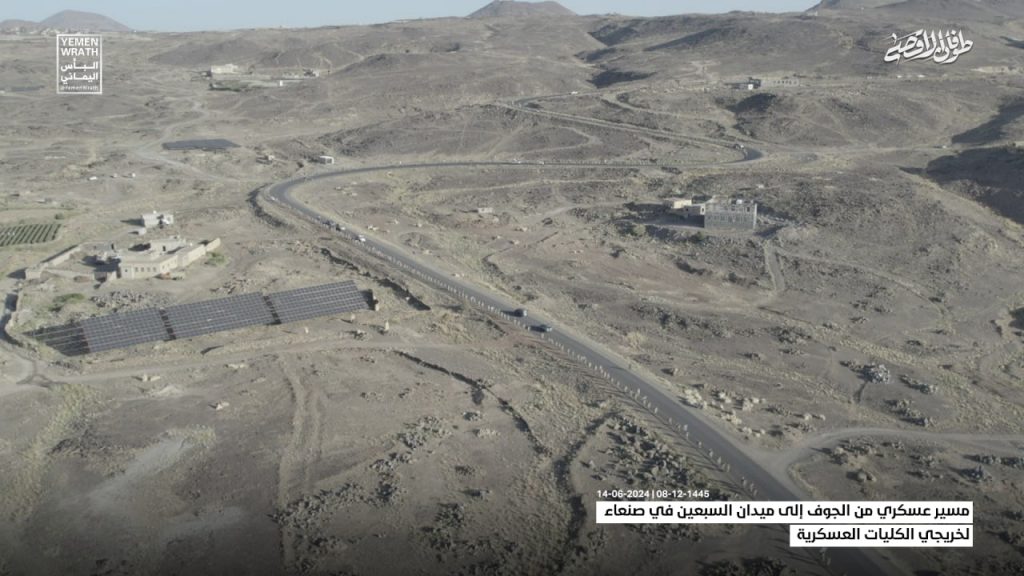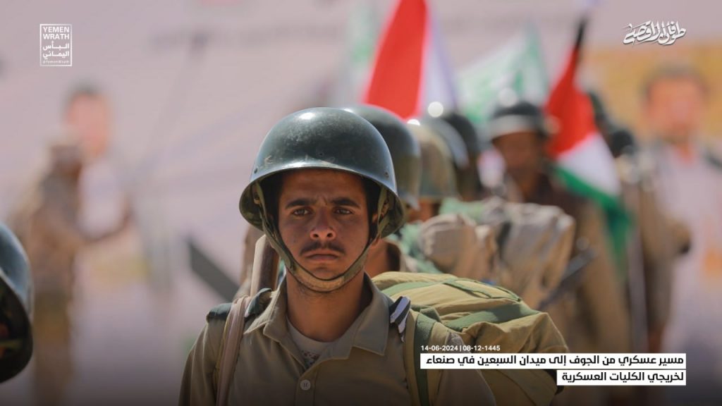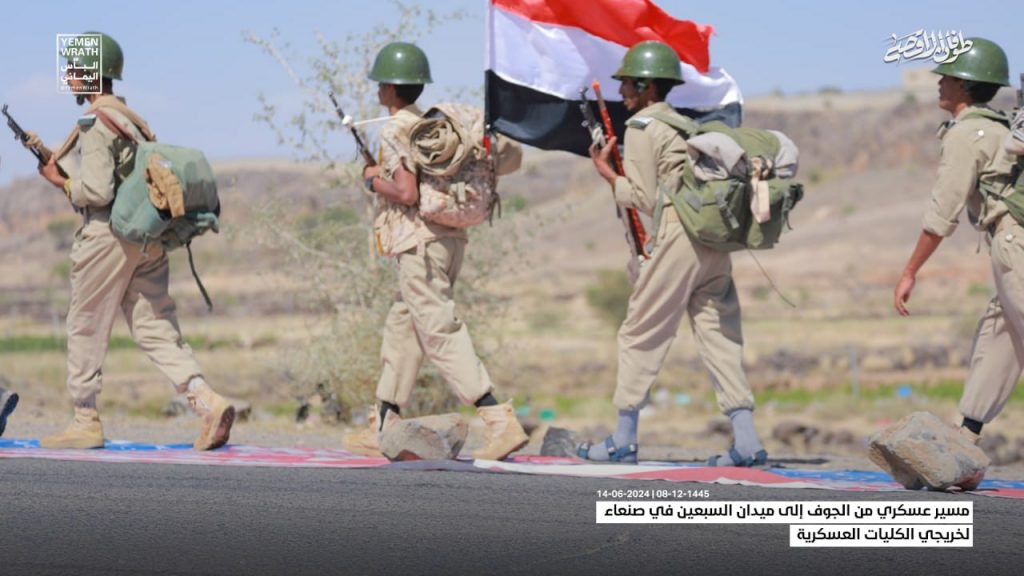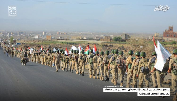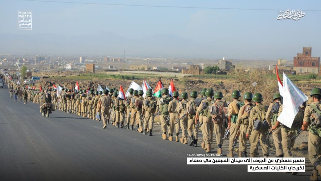 مسير عسكري لخريجي دفعه من الكليات العسكرية انطلق من محافظة الجوف وصولاً إلى ميدان السبعين بالعاصمة صنعاء للمشاركة في مسيرة “ثابتون مع غزة ومتصدون لكل المؤامرات” 08-12-1445 | 14-06-2024