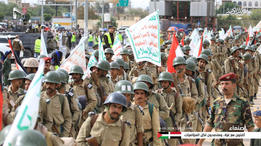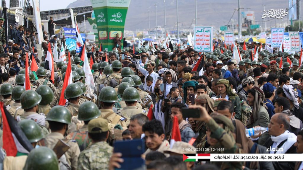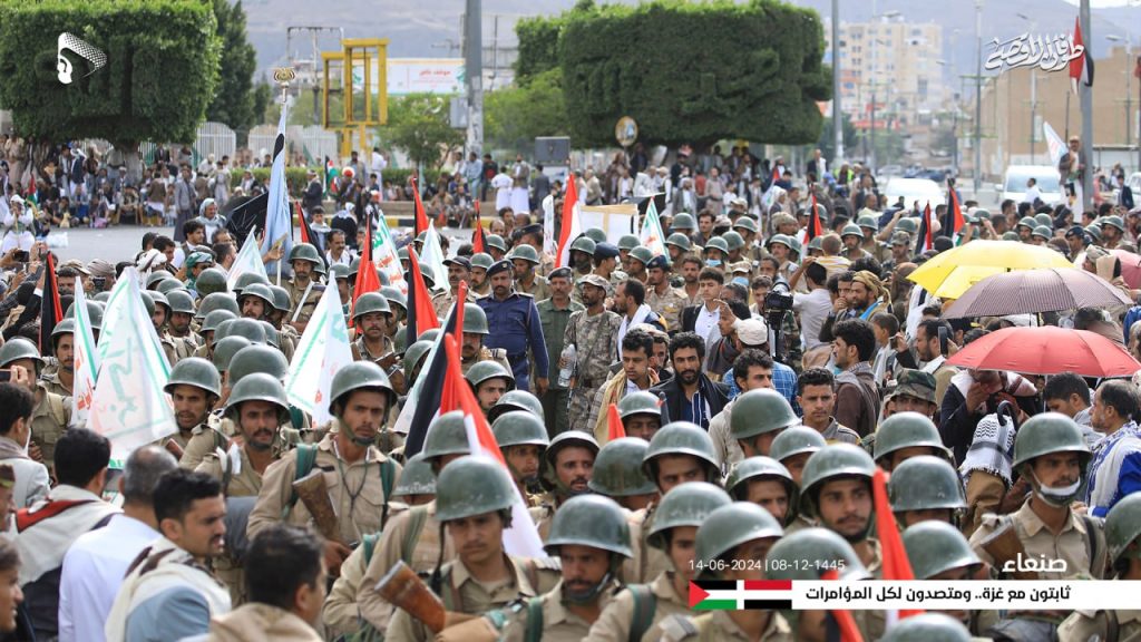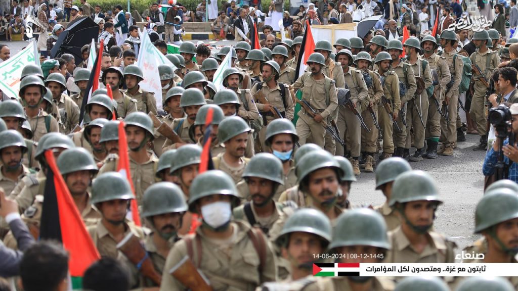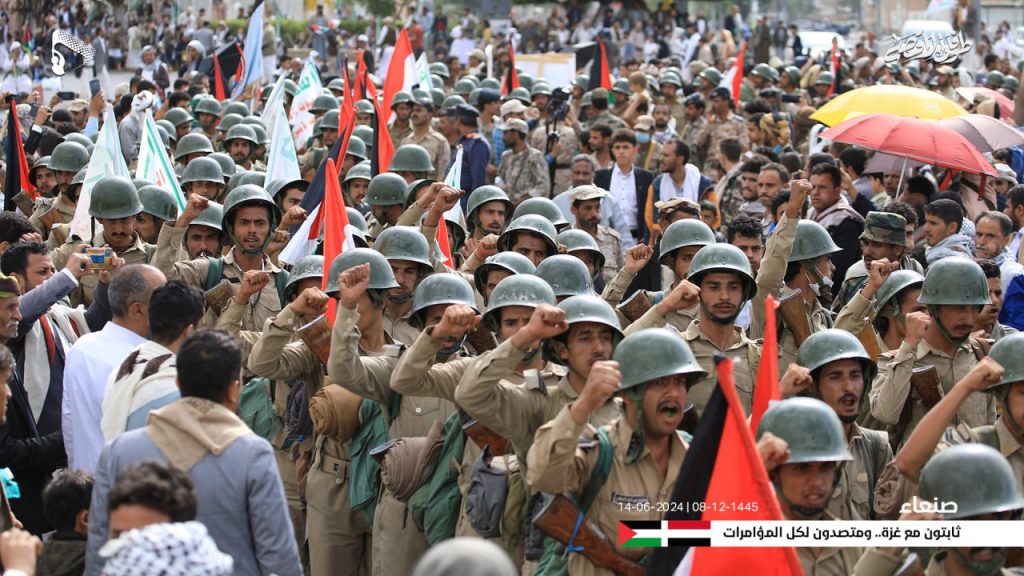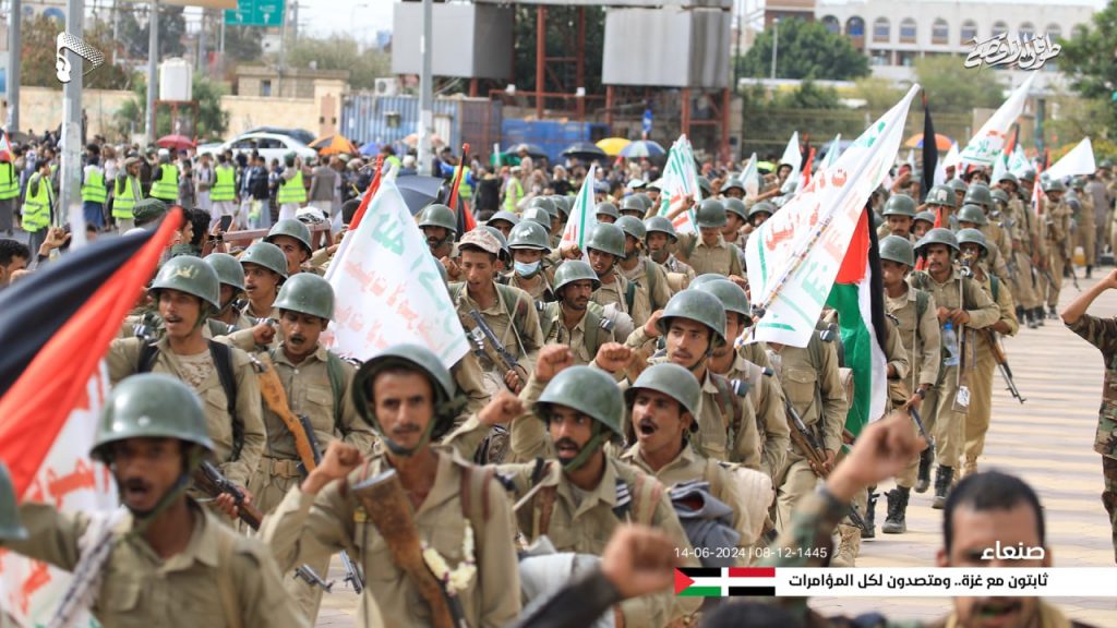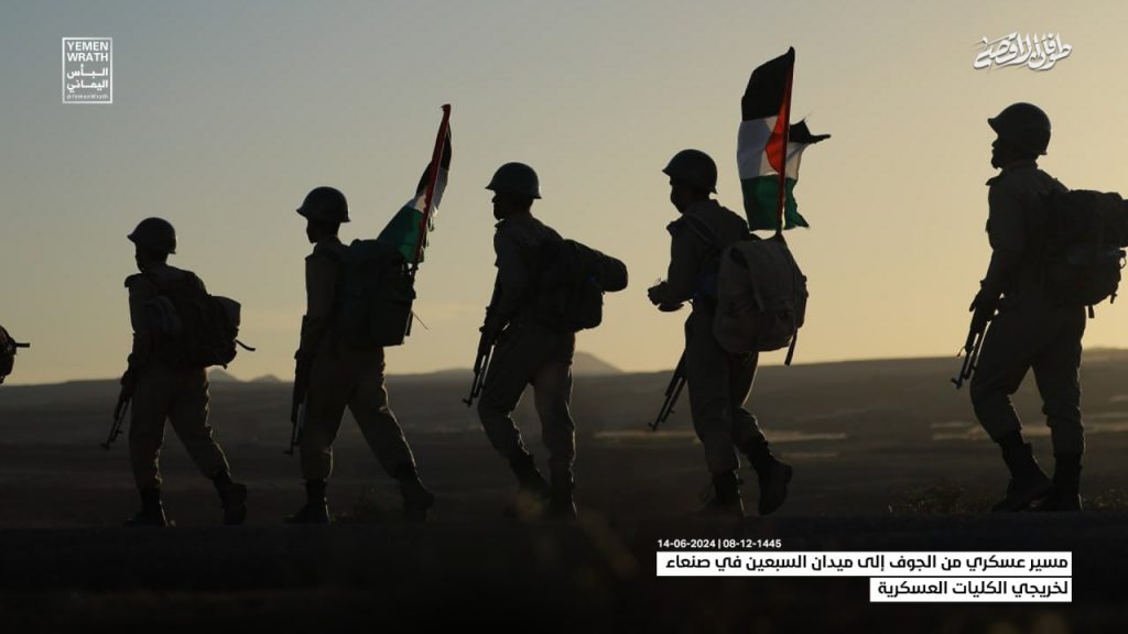 مسير عسكري لخريجي دفعه من الكليات العسكرية انطلق من محافظة الجوف وصولاً إلى ميدان السبعين بالعاصمة صنعاء للمشاركة في مسيرة “ثابتون مع غزة ومتصدون لكل المؤامرات” 08-12-1445 | 14-06-2024