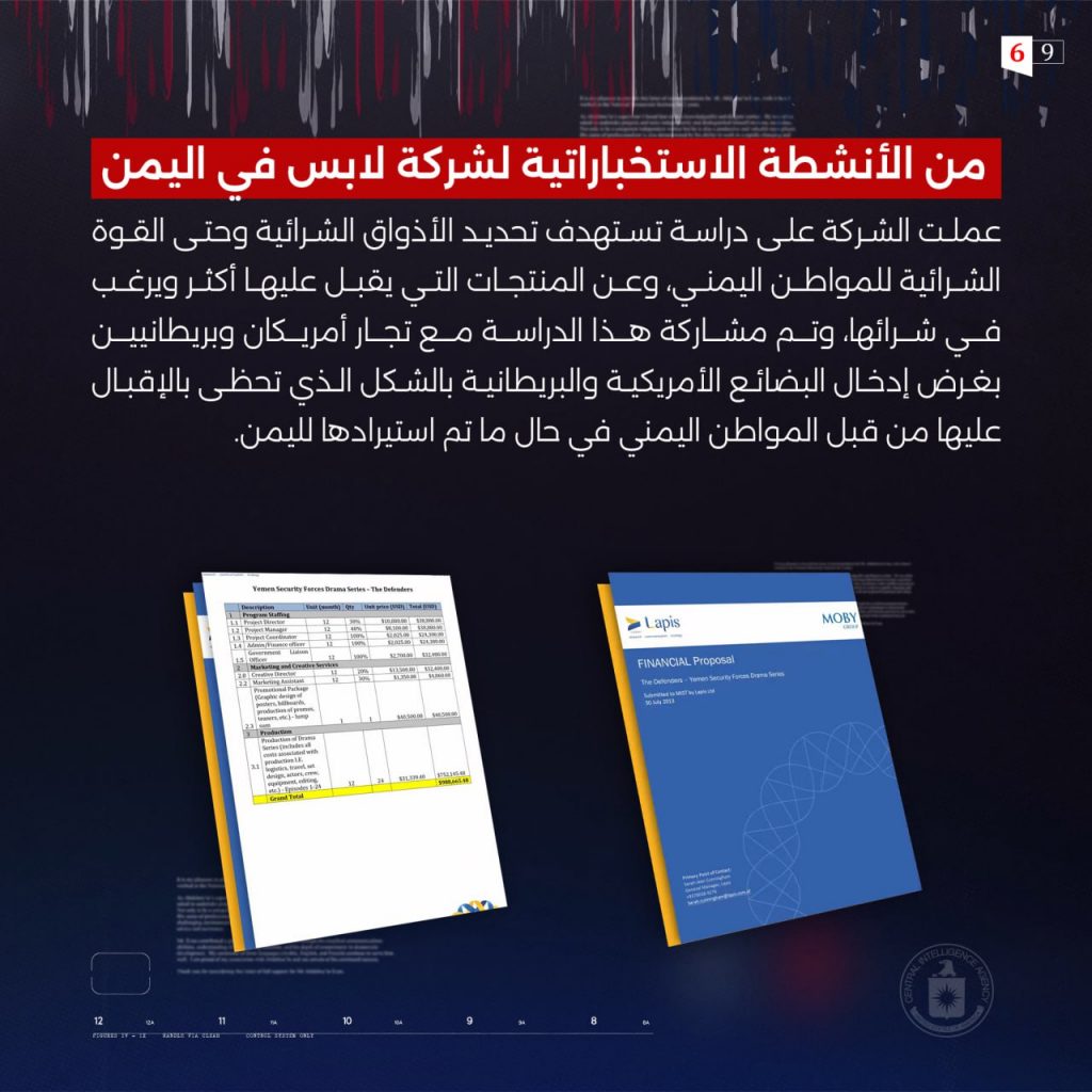 ويواصل: “الدراسات التي قمنا بها في شركة لابس تركزت بشكل أساسي على جمع المعلومات عن ميول المواطن اليمني وتوجهاته والتحديات التي بتواجهه، وعن الوسائل التي يحب أن يتم مخاطبته من خلالها، وهذه المعلومات بشكل أساسي كانت ترسل وتشارك مع جهات مثل وزارة الدفاع الأمريكية، و مثل المخابرات الأمريكية، بالإضافة إلى أنها كانت معلومات يمكن أن يتم استغلالها، والاستفادة منها سواء لأغراض عسكرية أو أمنية أو سياسية أو اقتصاديه أو في أي شيء”.