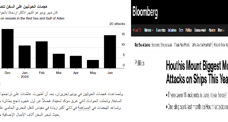 Bloomberg “بلومبيرغ” الأمريكية: الحوثيون يصعدون هجماتهم البحرية على السفن وشهر يونيو كان الأكثر شراسة منذ بداية العام