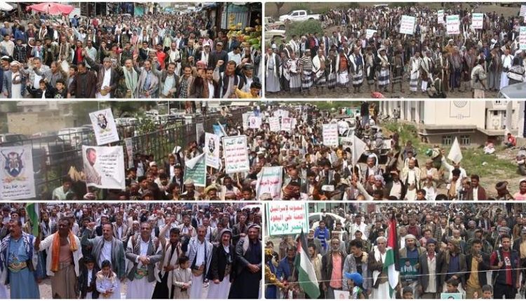 وتوزعت المسيرات في إب ومديرياتها على 40 ساحة بـ” الرسول الأعظم بالمدينة، يريم، القفر، المخادر، العدين، ذي السفال، العدين، دلال سوق الليل، المنار، مركز بعدان ، سوق الأحد، مركز السبرة، الشعر ، الرضمة، حبيش، حزم العدين، شلف، مركز العدين، السدة، النادرة، الأفيوش، حليان، مذيخرة”.