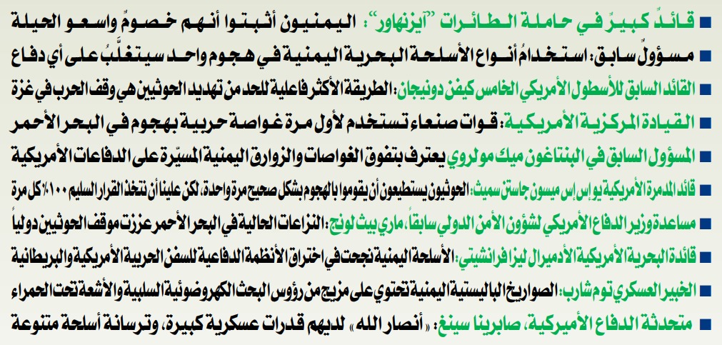 وبحسب التقرير فقد أطلقت طائرات مجموعة الحاملة “ايزنهاور” أكثر من 400 صاروخ جو أرض، و55 صاروخ جو-جو، أثناء فترة تواجدها في البحر الأحمر.