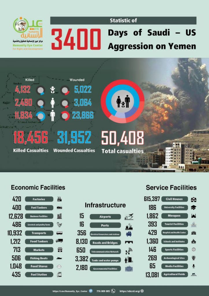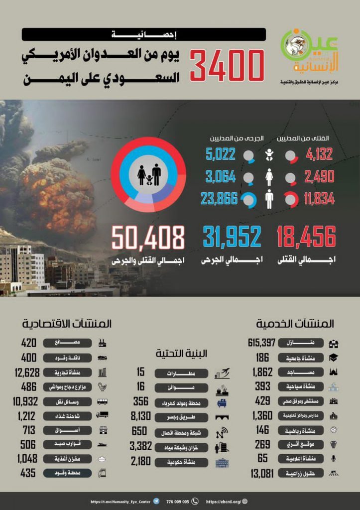 نشر مركز عين الإنسانية للحقوق والتنمية، اليوم، إحصائية جديدة للجرائم التي ارتكبها تحالف العدوان الأمريكي السعودي في اليمن خلال 3.400 يوم من العدوان والحصار.