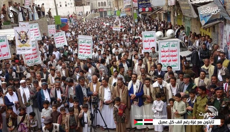 وباركت الحشود الجماهيرية عمليات القوات المسلحة اليمنية في استهداف قلب “تل أبيب”، نصرة ومساندة للشعب الفلسطيني وسفن العدو الصهيوني وكذا السفن الأمريكية والبريطانية والمتجهة إلى موانئ فلسطين المحتلة حتى إيقاف العدوان ورفع الحصار عن غزة.