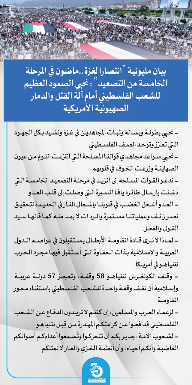وطالب البيان القوات المسلحة اليمنية باستمرار تصعيد العمليات النوعية في المرحلة الخامسة ضد العدو الصهيوني، والتي ُدشنت بإرسال طائرة يافا المسيرة التي وصلت إلى قلب العدو، وستكون هذه المرحلة بإذن الله نكالاً للكافرين وشفاءً لصدور قوم مؤمنين .