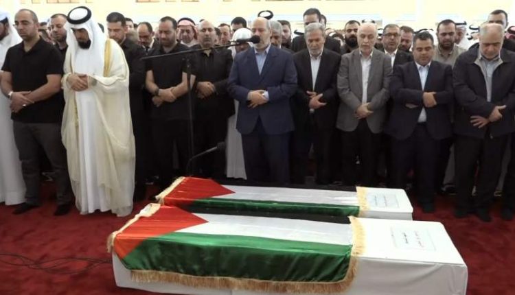 وأم عضو المكتب السياسي لحركة حماس خليل الحية، المصلين على الشهيد الشهيد إسماعيل هنية وحارسه الشهيد وسيم أبو شعبان في المسجد القطري، قبل أن يحمل نعش الشهيدان، المُسجى بالعلم الفلسطيني، إلى مقبرة المؤسس في لوسيل.