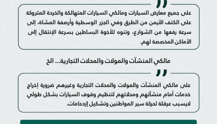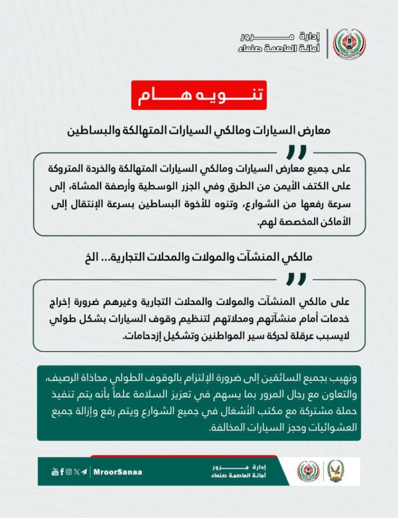 دعت شرطة المرور بأمانة العاصمة صنعاء جميع معارض بيع وشراء السيارات، ومالكي السيارات المتهالكة والخردة المتروكة على الكتف الأيمن من الطرق وفي الجزر الوسطية وأرصفة المشاة إلى سرعة رفعها من الشوارع، كما دعت أصحاب البسطات والباعة المتجولين سرعة الانتقال إلى الأماكن المخصصة لهم بعيداً عن الشوارع الرئيسية.