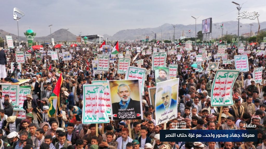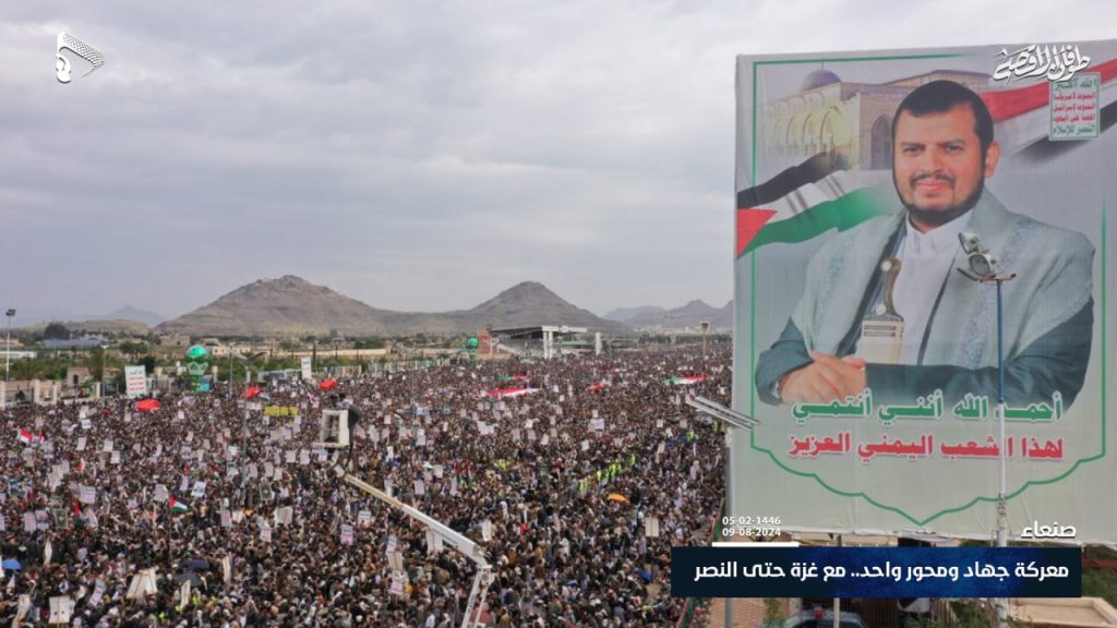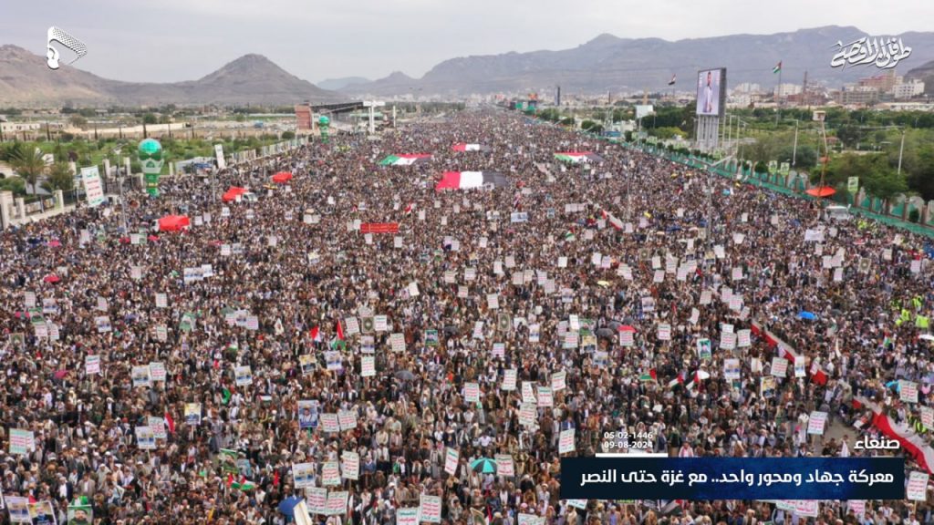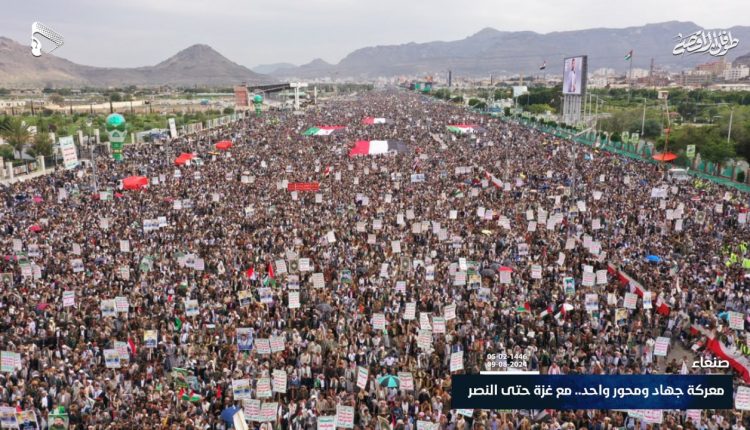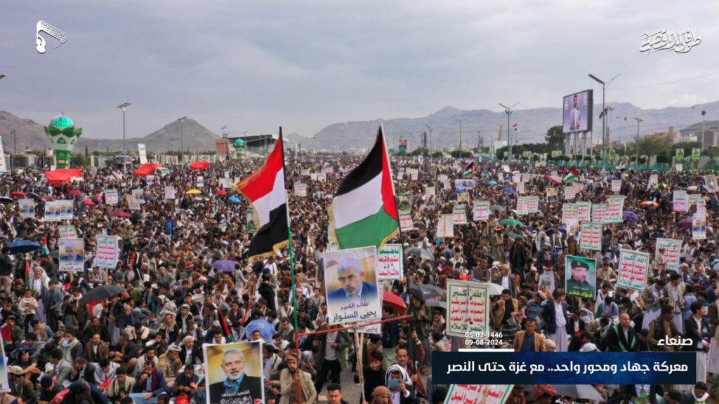 دعماً وإسناداً للقائد “يحيى السنوار وشعب فلسطين ومجاهديه، وتأكيداً بأن الرد قادم… حشود مليونية في مسيرة “معركة جهاد ومحور واحد.. مع غزة حتى النصر” في ميدان السبعين بالعاصمة صنعاء 05-02-1446 | 09-08-2024