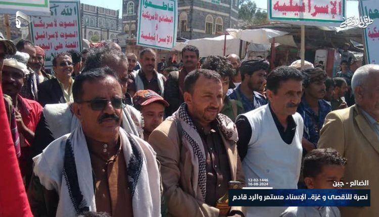 خروج جماهيري حاشد لأبناء محافظة الضالع في 6 ساحات نصرة للشعب الفلسطيني ومقاومته الباسلة