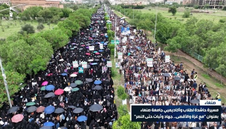 مسيرة حاشدة لطلاب وأكاديميي جامعة صنعاء بعنوان “مع غزة والأقصى.. جهاد وثبات حتى النصر”