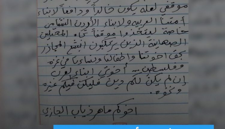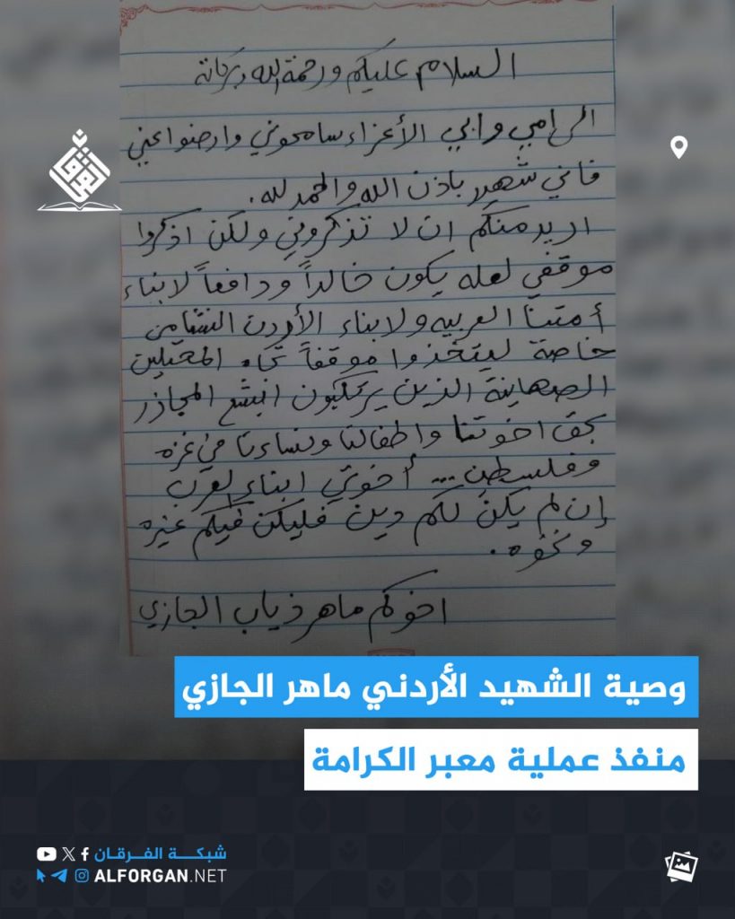 وصية الشهيد الأردني ماهر الجازي منفذ عملية معبر الكرامة وصية الشهيد الأردني ماهر الجازي منفذ عملية معبر الكرامة On سبتمبر 9, 2024 الصمود| صورة مشاركة