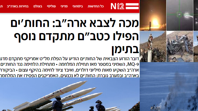 وقال موقع القناة العبرية الثانية عشرة أن القوات المسلحة اليمنية “حقّقت إنجازًا آخرَ هذا الأسبوع، ووجَّهت ضربةً موجعة إضافية للجيش الأمريكي من خلال إسقاط طائرة (إم كيو-9) المتطورة، وهي الثامنة من نوعها منذ بدء الحرب”.