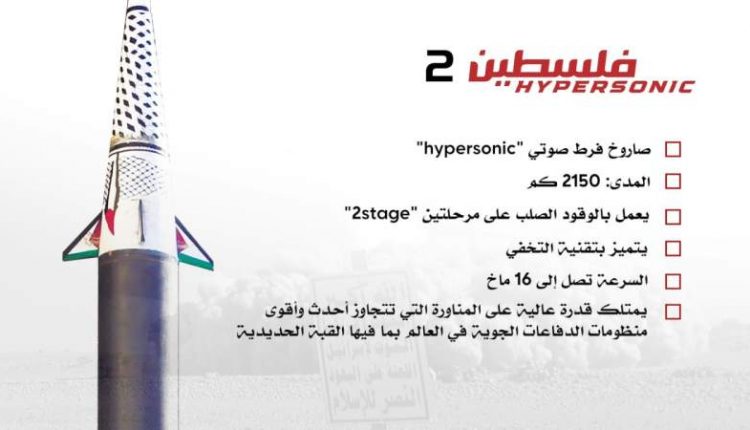 وعقب الإعلان عن أولى عملياتها الذي ضربت هدفا عسكريا في يافا المحتلة قلب كيان العدو الصهيوني، أزاحت القوات المسلحة الستار عن صاروخ “فلسطين 2” الفرط صوتي بمدى يصل إلى 2150 كم ويعمل بالوقود الصلب على مرحلتين.