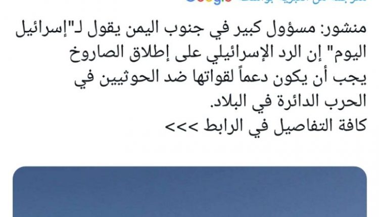 ونقلت صحيفة “إسرائيل هيوم” عن مسؤول رفيع في حكومة بن مبارك، يعتقد انه تابع للمجلس الانتقالي المدعوم إماراتيا، قوله إن رد إسرائيل على إطلاق الحوثيين الصاروخي الأخير يجب أن يشمل تزويد قواتنا البرية بأسلحة متطورة .
