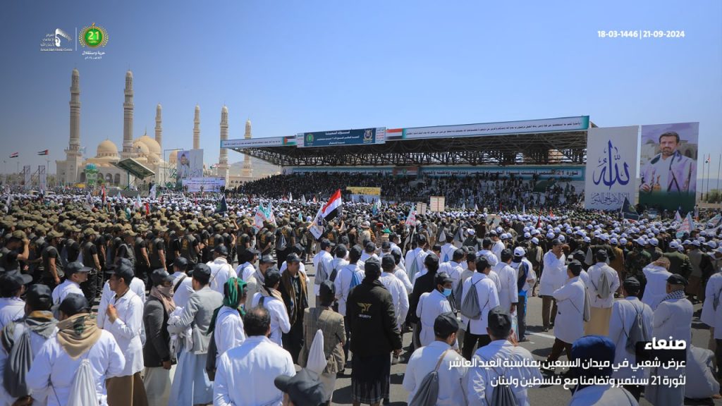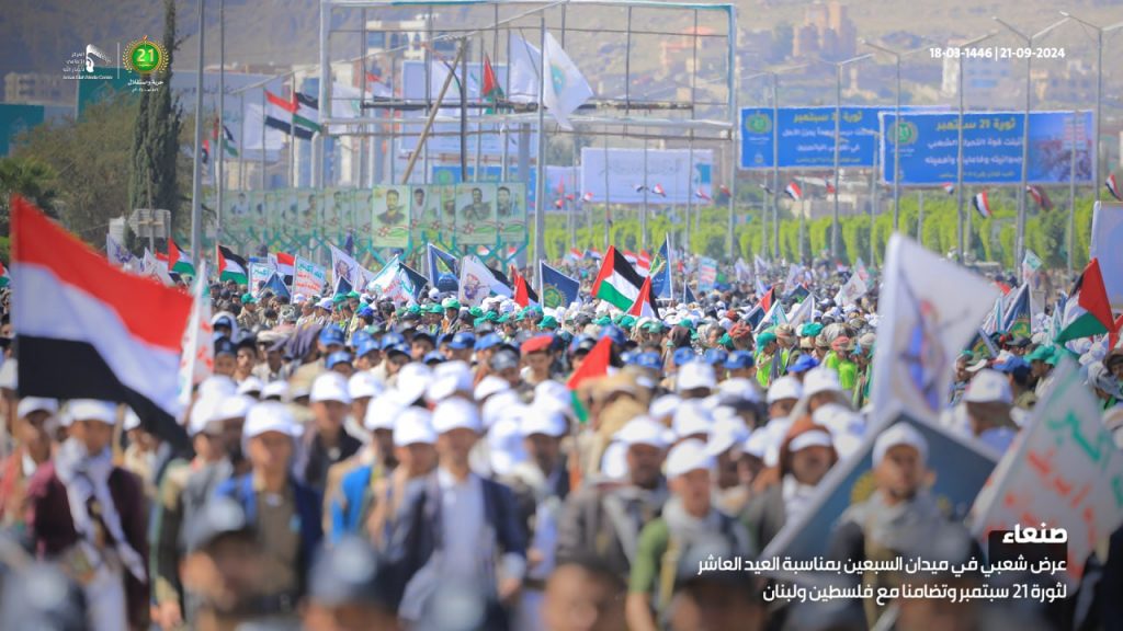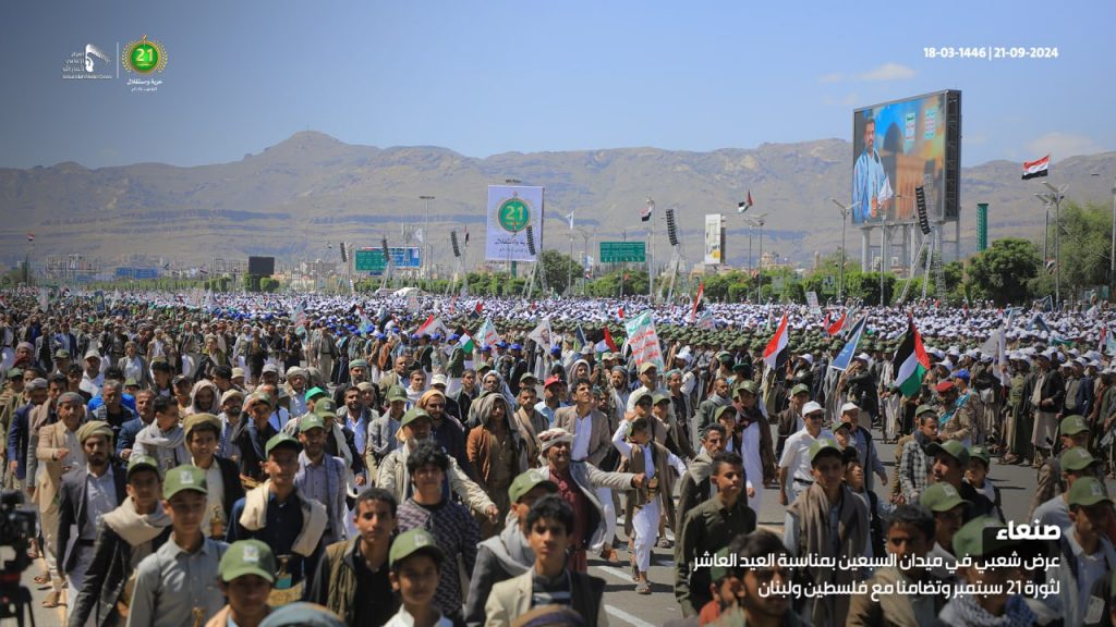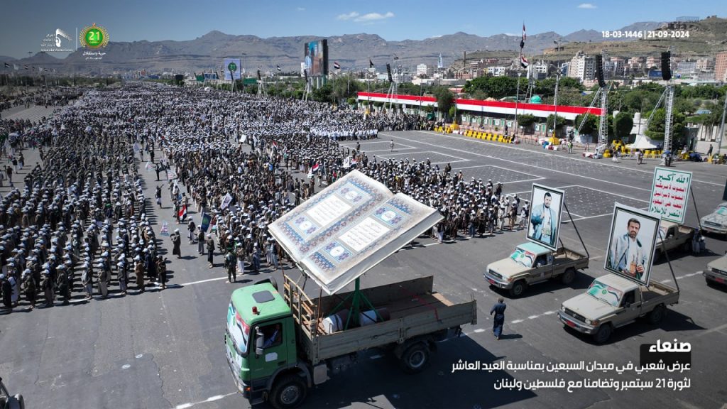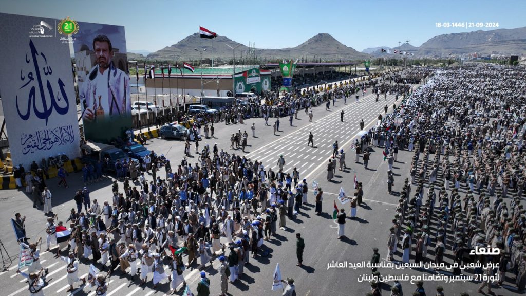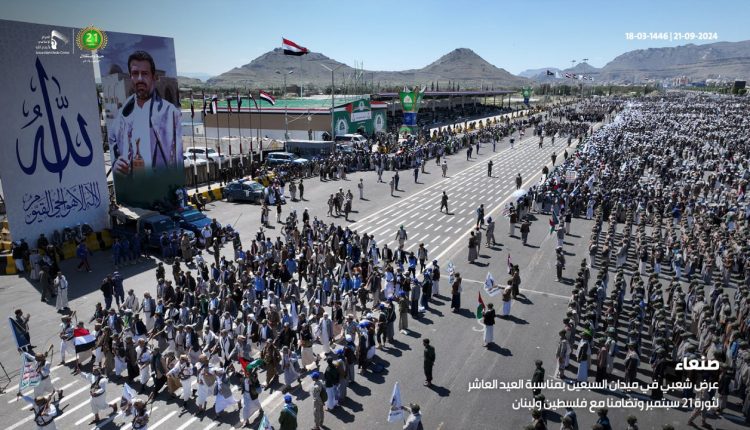 بالصور/ عرض شعبي في ميدان السبعين بالعاصمة صنعاء بمناسبة العيد العاشر لـ ثورة 21 سبتمبر وتضامنا مع فلسطين ولبنان