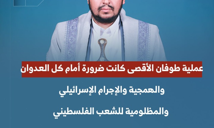 أكد السيد عبدالملك بدر الدين الحوثي، أن عملية طوفان الأقصى كانت ضرورة أمام كل العدوان والهمجية والإجرام الإسرائيلي والمظلومية للشعب الفلسطيني.. مشيرا إلى أن عملية طوفان الأقصى تأتي في إطار الحق المشروع الذي يمتلكه الشعب الفلسطيني لمواجهة العدو المحتل الذي لا يمتلك أي مشروعية لا في احتلاله ولا في ظلمه وارتكابه للجرائم.