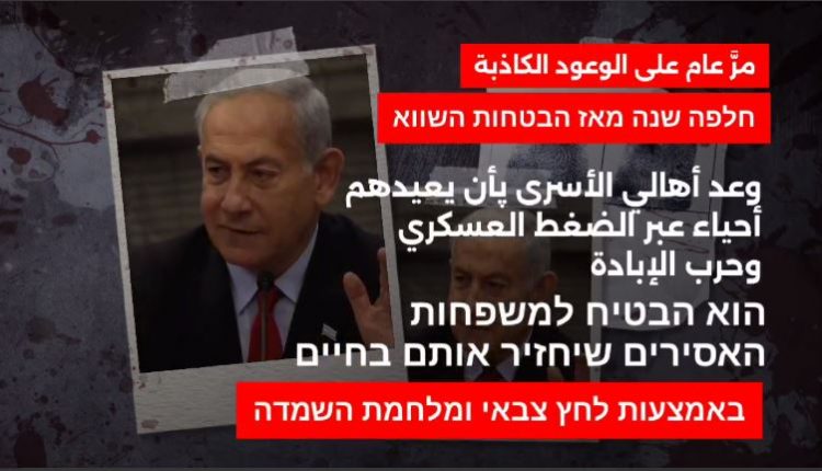 قالت حركة المقاومة الإسلامية حماس، الليلة الماضية، لأهالي الأسرى الصهاينة في قطاع غزة، إنه بعد مرور عام على الوعود التي قطعها رئيس حكومة الكيان الصهيوني بنيامين نتنياهو باستعادتهم “أحياء عبر حرب الإبادة”، فإن “مصير أبنائكم إلى المجهول!”.