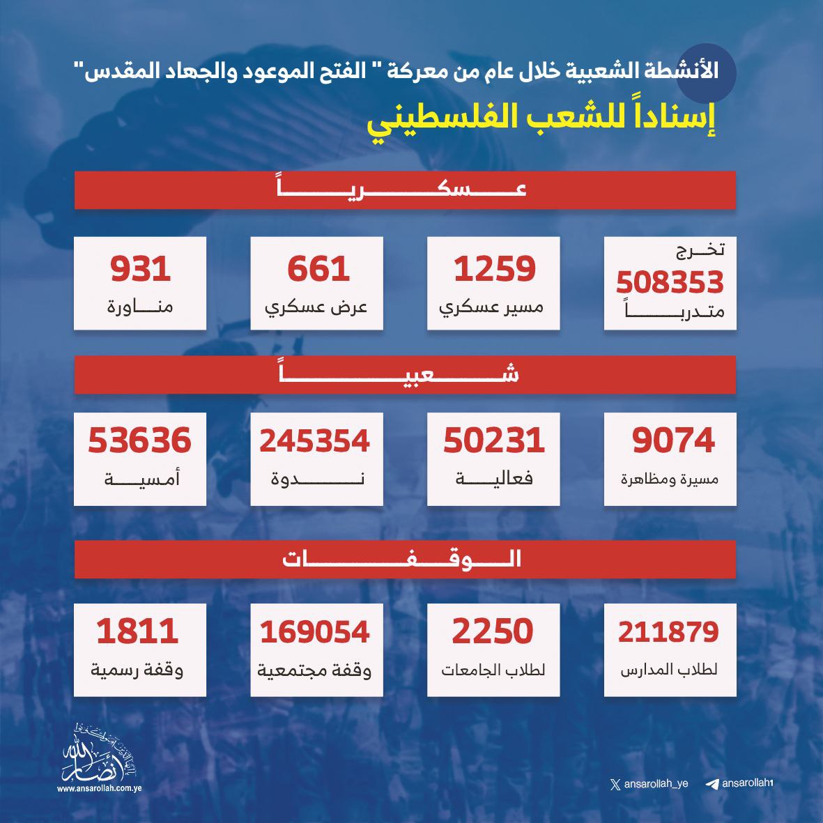 ودعماً للقضية الفلسطينية، أشار مسؤول التعبئة إلى أن أمانة العاصمة والمحافظات الحرة تحولت إلى ساحات حراك شعبي واسع، حيث تم تنظيم 9،497 مسيرة ومظاهرة و50,430 فعالية متنوعة، و170,165 وقفة شعبية ومجتمعية و216,087 وقفة طلابية في الجامعات والمدارس و246,708ندوة و53,668 أمسية.