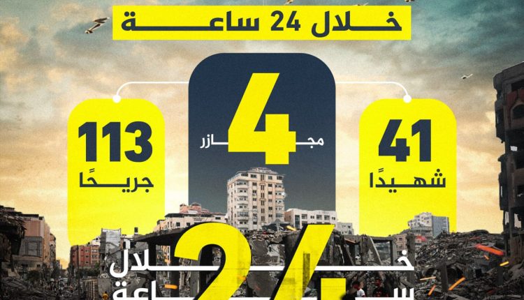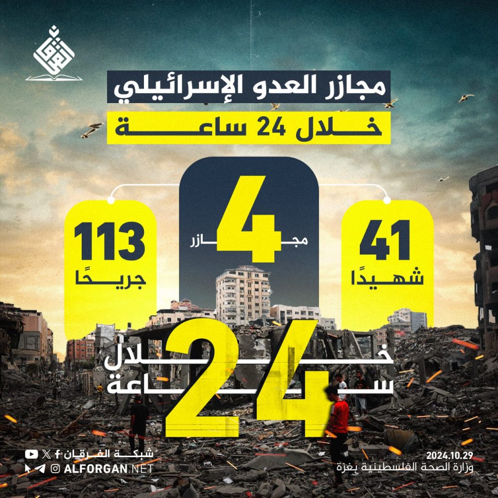 إنفوجرافيك/ مجازر العدو الصهيوني في قطاع غزة خلال 24 ساعة On أكتوبر 29, 2024 الصمود| إنفوجرافيك وزارة الصحة بغزة: العدو الإسرائيلي ارتكب 4 مجازر ضد العائلات في قطاع غزة وصل منها للمستشفيات 41 شهيدا و113 جريحا خلال 24 ساعة مشاركة