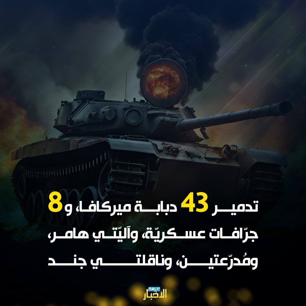 ووفق غرفة عمليات المقاومة فإن الحصيلة التراكمية لخسائر الاحتلال منذ بدء ما يسمى الهجوم البريّ في جنوب لبنان بلغت أكثر من 100 قتيل وألف جريح من ضباط وجنود إضافة إلى تدمير 43 دبابة ميركافا، و8 جرّافات عسكريّة، وآليّتي هامر، ومُدرّعتين، وناقلتي جند، فضلا عن إسقاط 4 مسيّرات من طراز هرمز 450 ومُسيّرَتين من طراز هرمز 900.