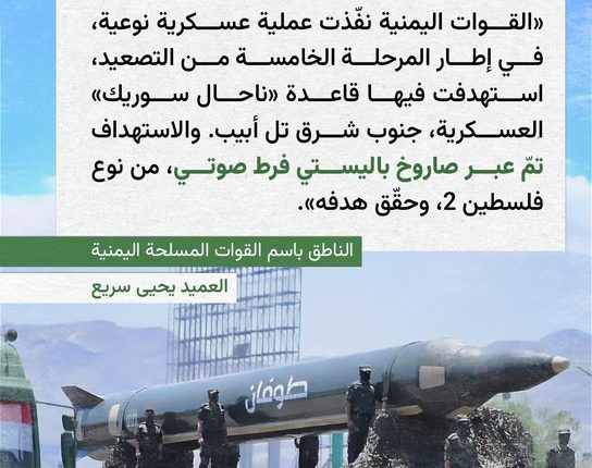 وأعلن الناطق باسم القوات المسلحة اليمنية، العميد يحيى سريع، أن تلك القوات نفّذت، أمس، عملية عسكرية نوعية، في إطار «المرحلة الخامسة» من التصعيد، استهدفت فيها قاعدة «ناحال سوريك» العسكرية، جنوب شرق تل أبيب. وقال، في بيان، إن «الاستهداف تم عبر صاروخ باليستي فرط صوتي، من نوع فلسطين 2، وحقق هدفه»، مؤكداً أن «الإصابة كانت دقيقةً، وأدت إلى نشوب حريق في محيط الموقع المستهدف».