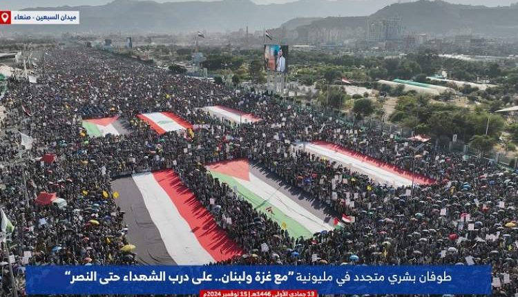 البيان الصادر عن المسيرات المليونية التي خرجت تحت شعار (مع غزة ولبنان.. على درب الشهداء حتى النصر)، بارك “القرار الجريء والشجاع والتاريخي لقائدنا الحكيم والمؤمن السيد عبد الملك بدرالدين الحوثي ـ يحفظه الله ـ بتنفيذ عملية نوعية مسددة ضد حاملة طائرات وعدد من البوارج الأمريكية في البحرين الأحمر والعربي التي أحبطت التحضيرات الأمريكية لشن أكبر عدوان كان العدو ينوي تنفيذه ضد شعبنا لمحاولة ثنينا عن موقفنا الثابت المساند للشعبين الفلسطيني واللبناني”.