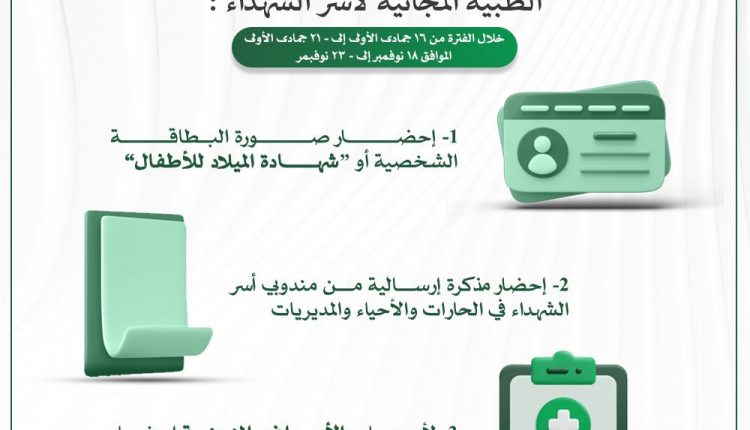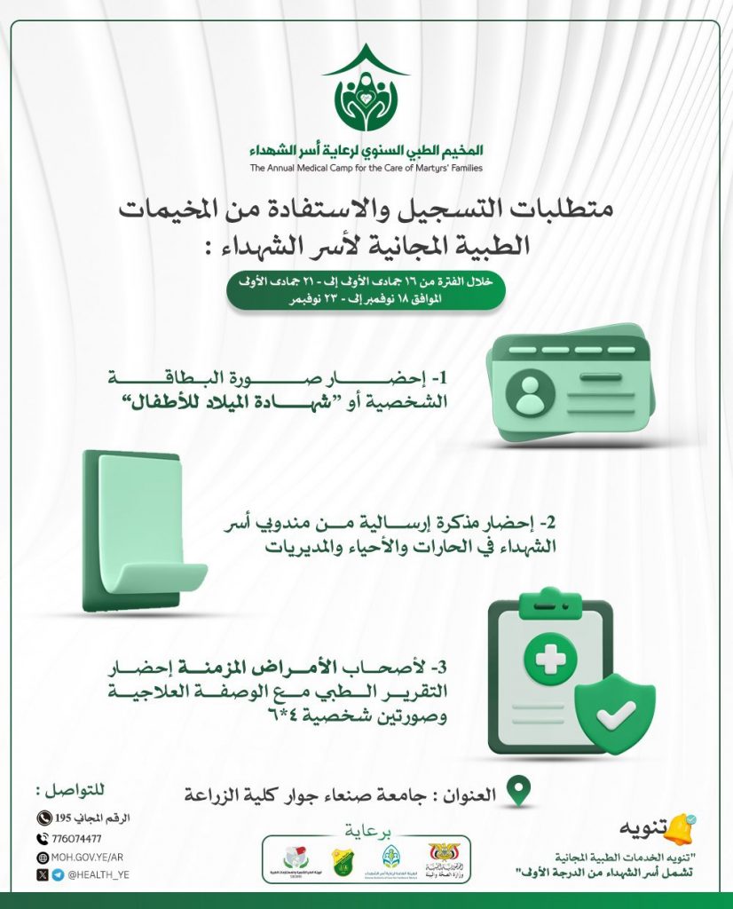 متطلبات التسجيل والاستفادة من المخيمات الطبية المجانية لأسر الشهداء (صورة)