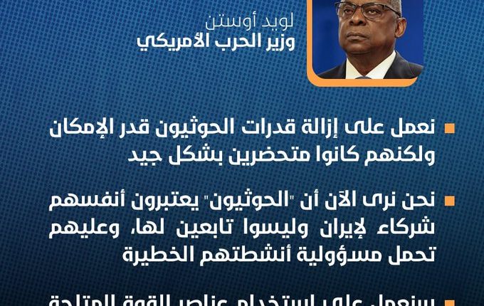 وخلال مؤتمر صحفي قال أوستن : “لقد نفذنا هجمات على قدرات الحوثيين… وكانت خماط هجمات متعددة في بعض الحالات على مدار الأسابيع، وسنستمر في القيام بذلك لاستهداف أكبر قدر ممكن من قدرات الحوثيين”.