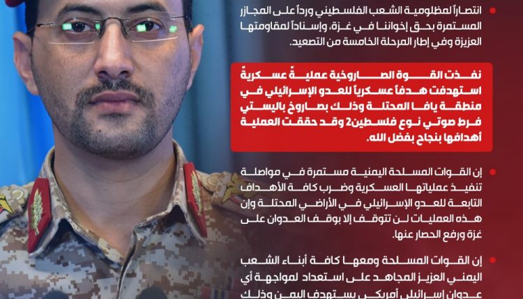 إنفوجرافيك/ بيان القوات المسلحة اليمنية بشأن استهداف هدفاً عسكرياً للعدو الإسرائيلي في منطقة يافا المحتلة بصاروخ باليستي فرط صوتي